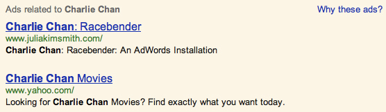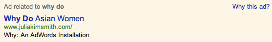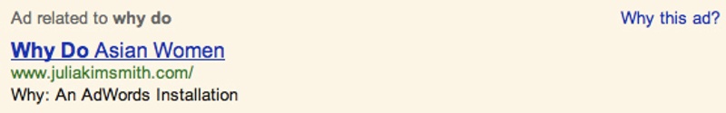 Armed with a free $100 Google AdWords gift card, Julia Kim Smith utilizes the internet to take on bigotry through the placement of Google ads that link to work on her website. Keywords include “Charlie Chan,” “why do asian women,” and “Pete Hoekstra” (the Michigan politician behind the infamous racist campaign ad which aired Super Bowl Sunday 2012).