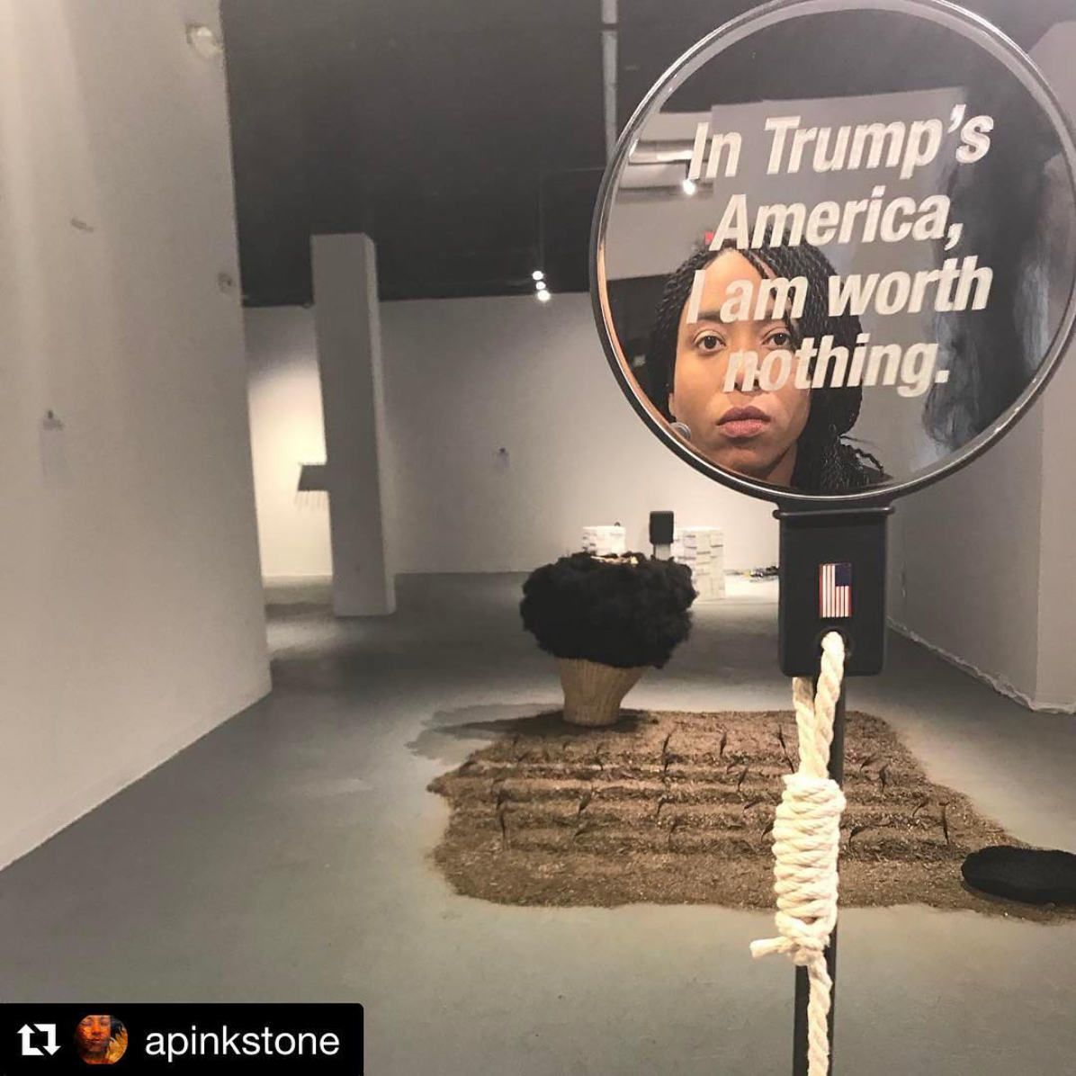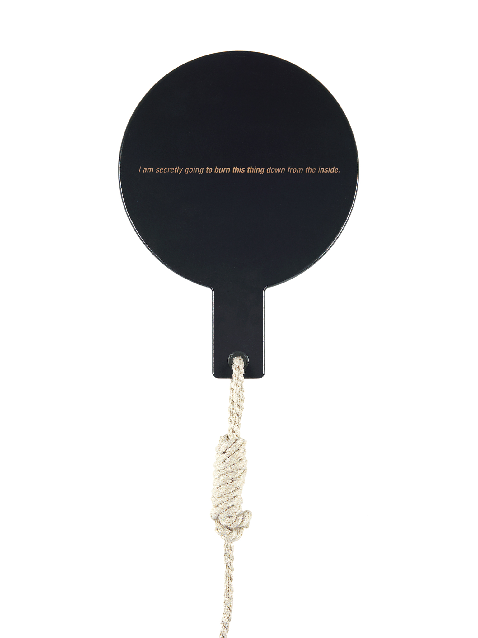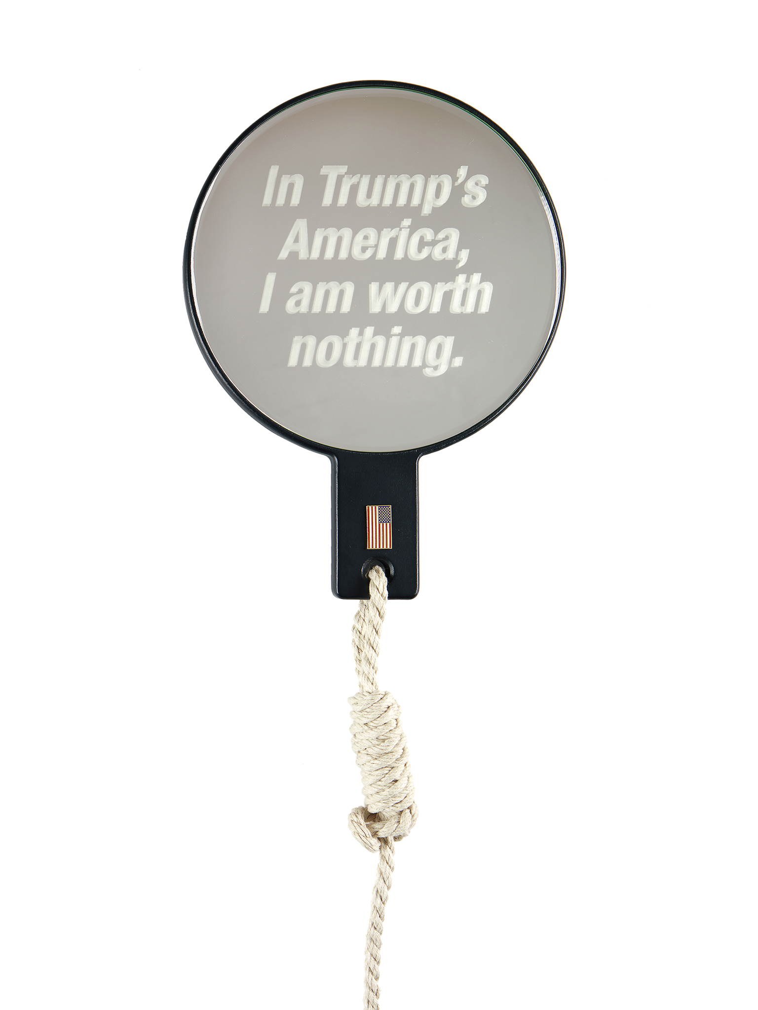 Selfie Mirror is a participatory installation piece: A hand mirror is mounted on a microphone stand with the words “IN TRUMP’S AMERICA, I AM WORTH NOTHING.” etched on the front of the mirror and “I AM SECRETLY GOING TO BURN THIS THING DOWN FROM THE INSIDE.” etched on the back.